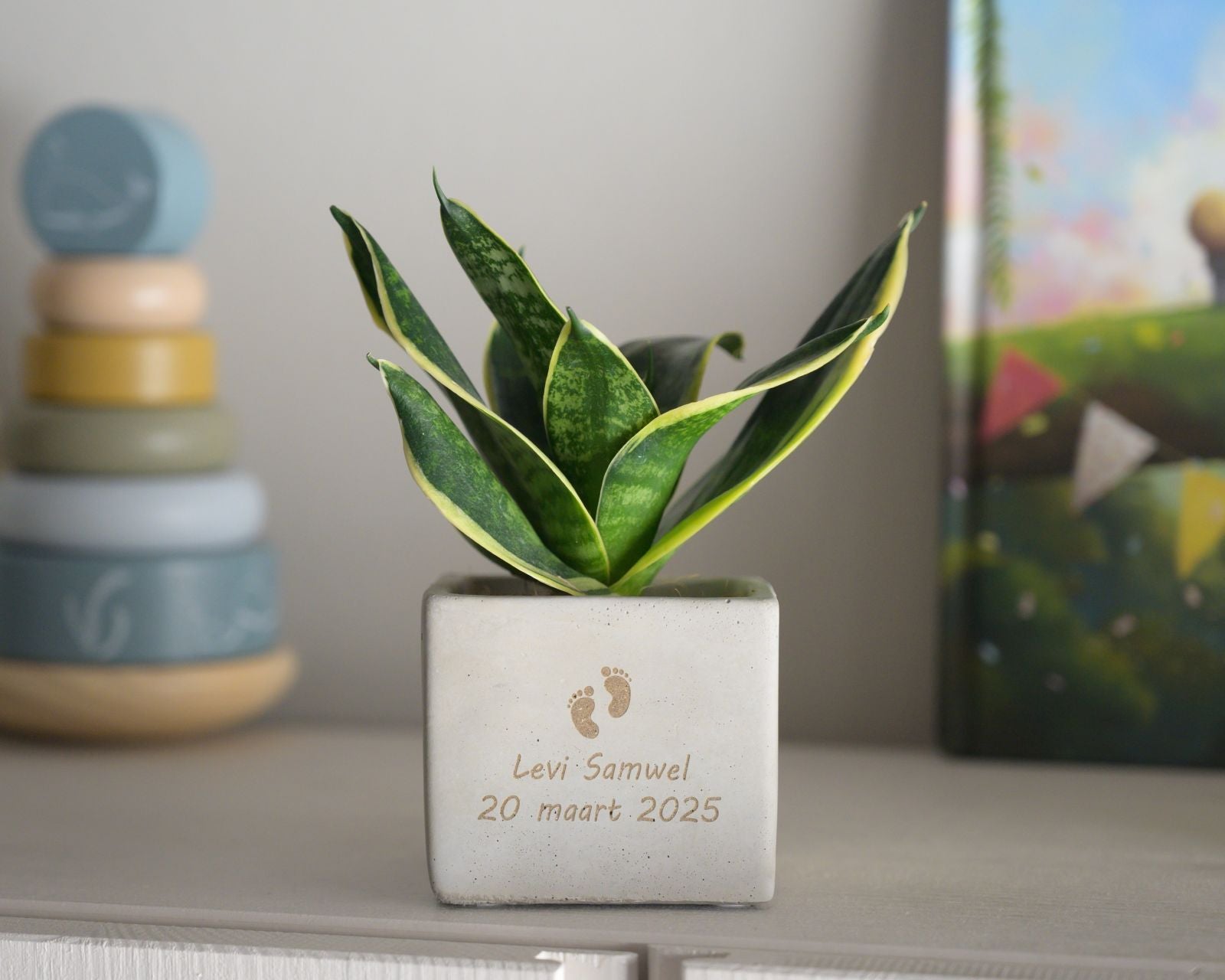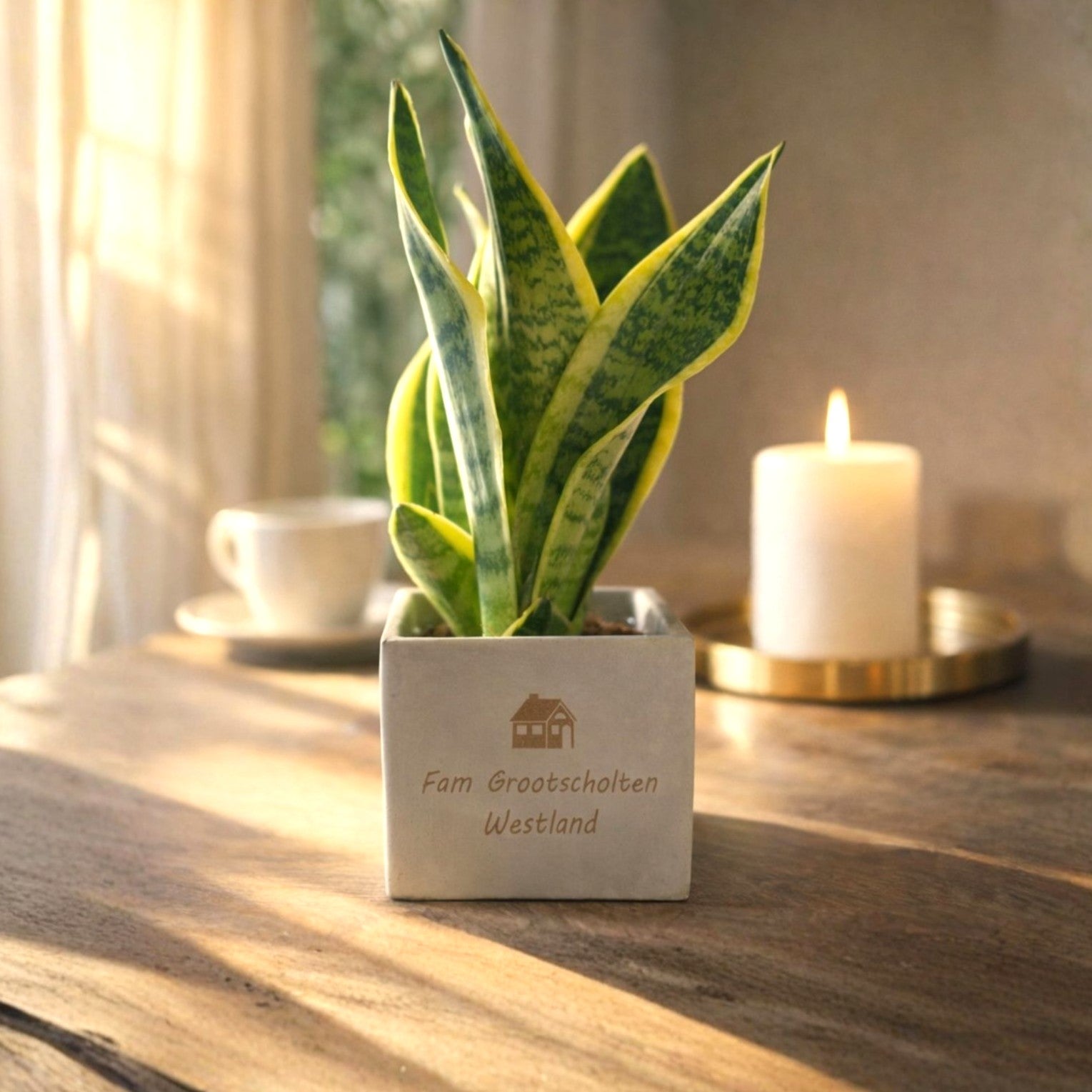 Gemaakt van natuurlijke materialen en gecombineerd met een sterke sansevieria. Tijdloos en passend in elk interieur.