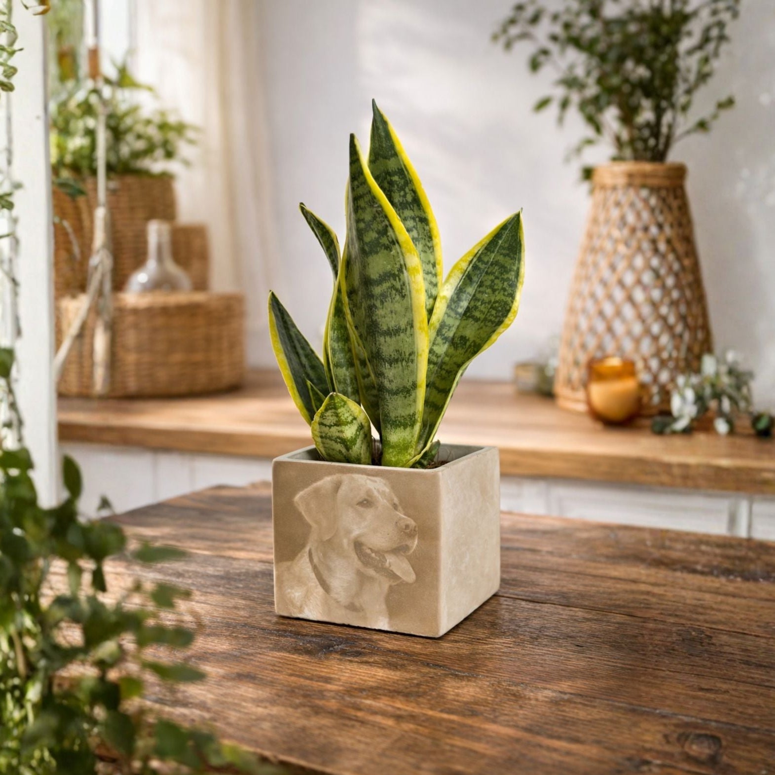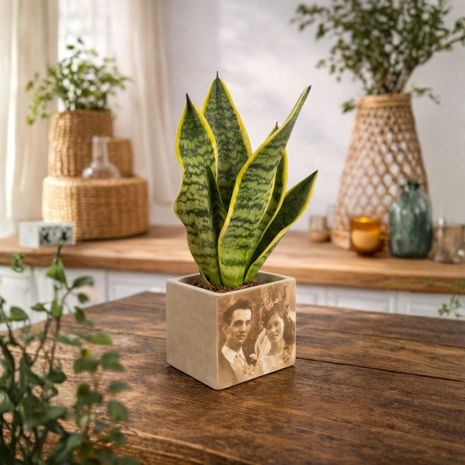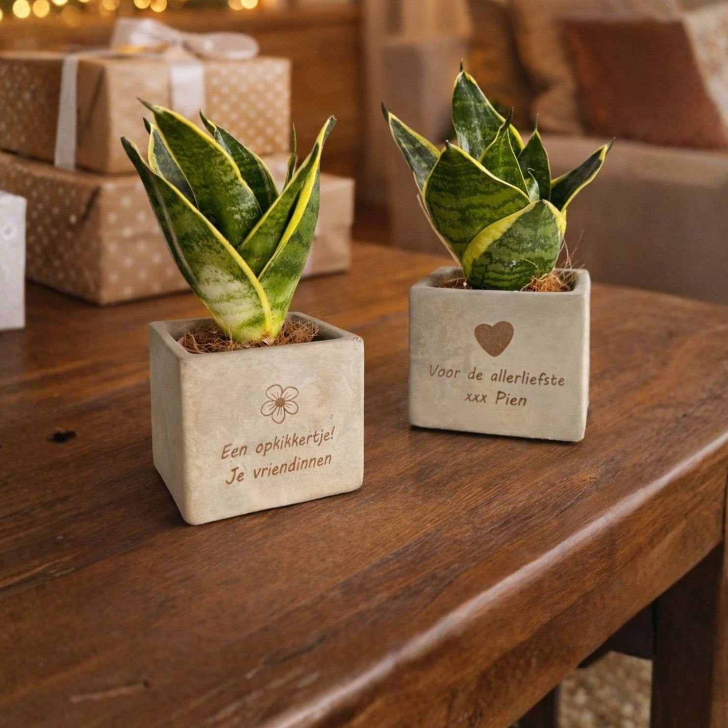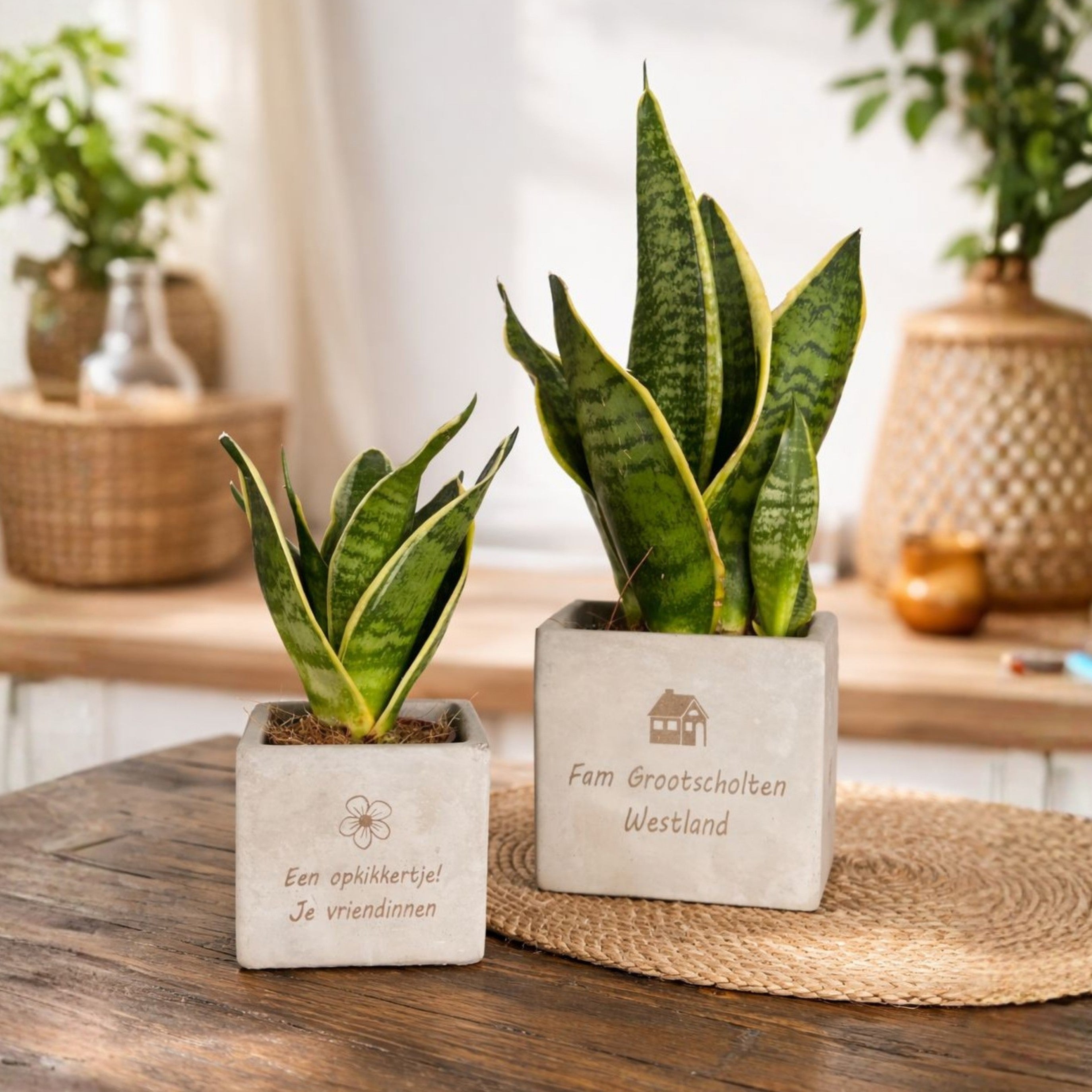 Gemaakt van natuurlijke materialen en gecombineerd met een sterke sansevieria. Tijdloos en passend in elk interieur.